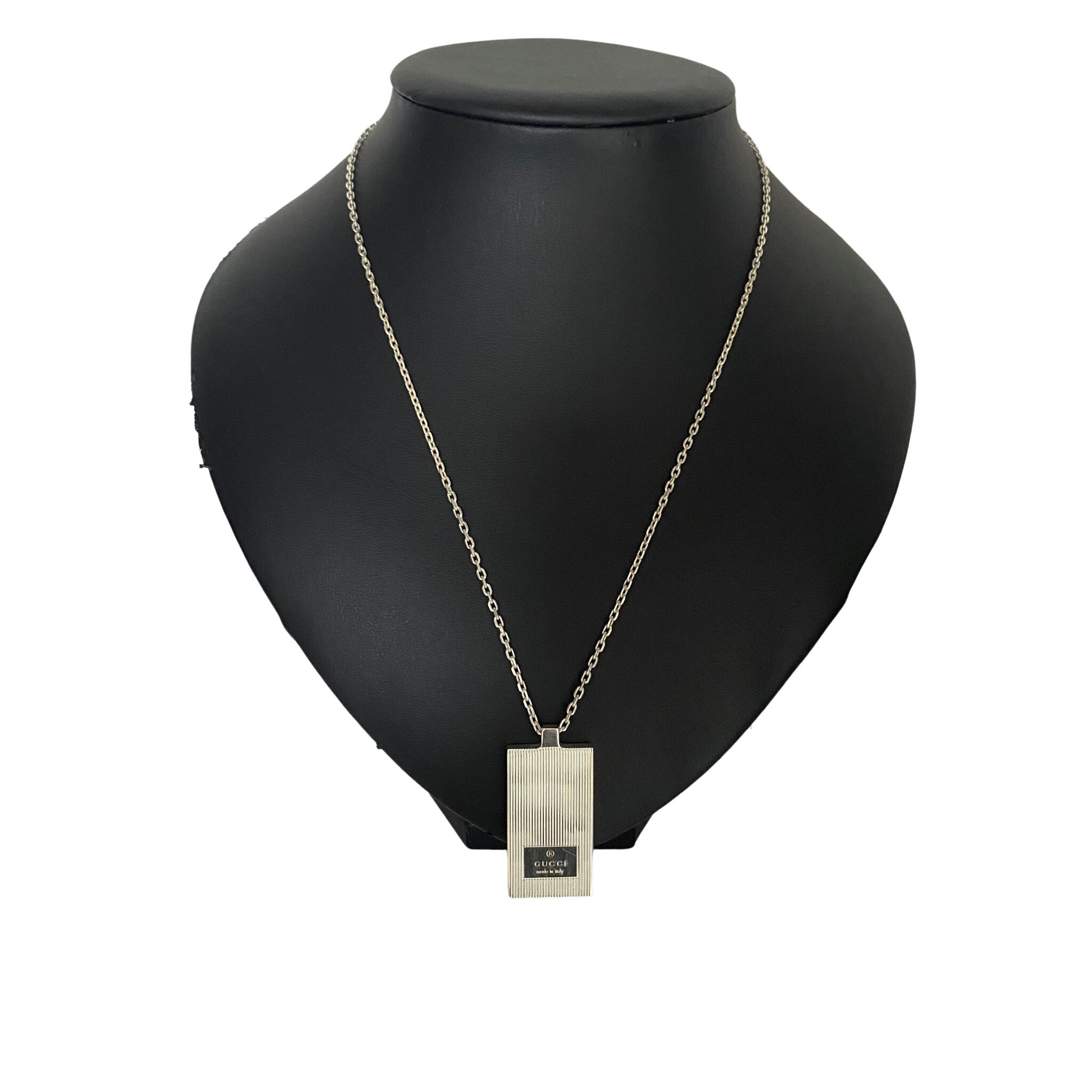 しっかりとしたシルバーの重みを感じる、「GUCCI」のロゴが刻印されたプレートネックレスです。